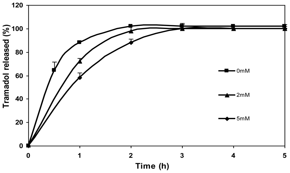 The effect of genipin concentration (0 mM, 2 mM and 5 mM) on the release of tramadol hydrochloride from chitosan microspheres is shown in Figure 8. As can be seen, drug release was slower in the case of microspheres crosslinked with genipin in comparison with the non crosslinked ones (0 mM). What is more, the tramadol release rate slowed down with increasing genipin concentration (5 mM genipin microspheres released the drug slower than 2 mM genipin microspheres). In the case of non crosslinked microspheres, a burst effect was observed during the initial hour (>80% of drug) and the total amount of drug encapsulated was released after 2 h. In contrast, the release of drug during the first hour from crosslinked microspheres was significantly lower. The amount of drug released after 2 h from microspheres crosslinked with genipin of different concentrations, 2 and 5 mM, was 97 and 88%, respectively, and it was completely released after 3 h. Therefore, as shown in preliminary studies, crosslinking with genipin controls the release of tramadol hydrochloride [].