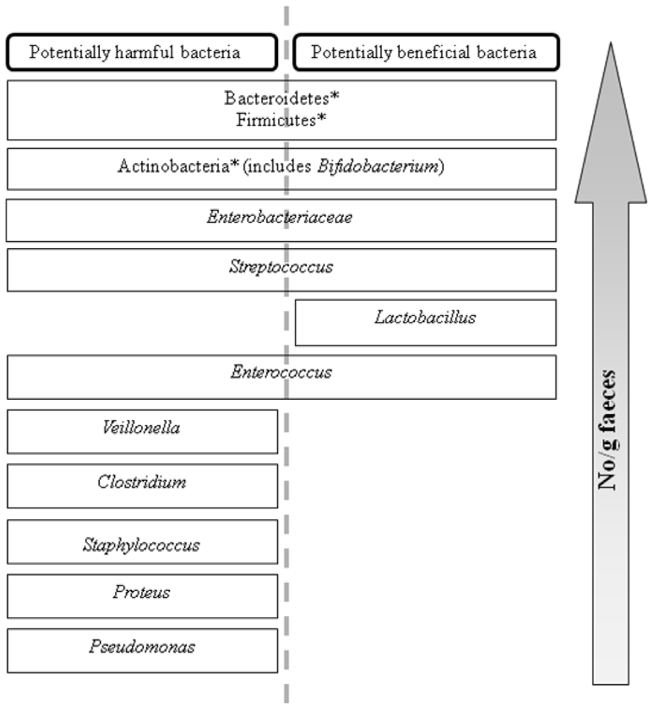 Distribution of the dominant, sub-dominant and minor components of human fecal microflora. Major dominant phyla are denoted. *: Other components are at the family or genus level (adapted from reference [16]).