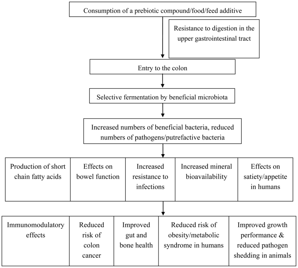 Prebiotic compounds may also be added to animal feed, as an alternative to antibiotics. Sub-therapeutic doses of antibiotics were used in-feed in Europe and continue to be used in the US as a management tool to promote growth and maintain health in farm animals, in particular pigs and poultry. However, due to concerns over increasing bacterial antibiotic resistance, in-feed antibiotics are no longer permitted for use as growth promoters in the EU since 2006. Consequences, including increased enteric infections, reduced pig performance and increased mortality have been seen in Nordic countries where the antibiotic ban has been in place since the late 1990s [29]. Therefore, one of the challenges facing the livestock industry is maintaining the growth performance targets required for Consumption of a prebiotic compound/food/feed additive Resistance to digestion in the upper gastrointestinal tract Entry to the colon Selective fermentation by beneficial microbiota Increased numbers of beneficial bacteria, reduced numbers of pathogens/putrefactive bacteria Production of short chain fatty acids Effects on bowel function Increased resistance to infections Effects on satiety/appetite in humans Increased mineral bioavailability Immunomodulatory effects Reduced risk of colon cancer Improved gut and bone health Reduced risk of obesity/metabolic syndrome in humans Improved growth performance & reduced pathogen shedding in animals cost-effective animal production without the use of antibiotic growth promoters. Although the exact mode of action of antibiotic growth promoters is unknown, they most likely act via modulation of intestinal microbial populations, including reduction of pathogenic microorganisms. Prebiotic compounds therefore offer potential as an alternative to in-feed antibiotic growth promoters [30]. Apart from improving animal performance and health, prebiotics may also reduce carriage of enteric pathogens, thereby preventing transmission to humans (Figure 2) [30].