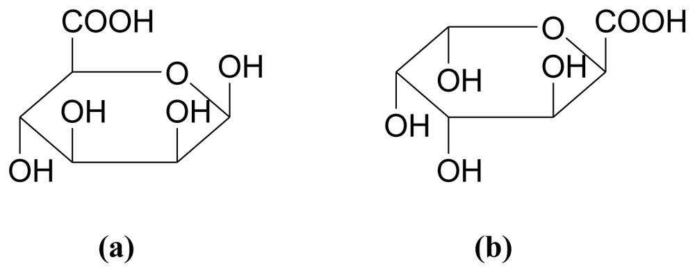 Constituent acids of alginic acid, where (a) is β-D-mannuronic acid and (b) is α-L-guluronic acid [43].