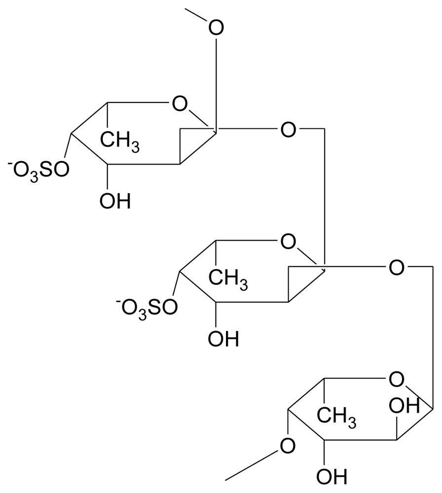 Fucoidan: Branched polysaccharide sulfate ester with L-fucose building blocks as the major component with predominantly α-(1,2) linkages [43].