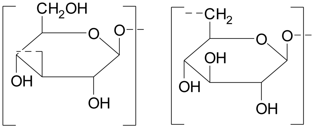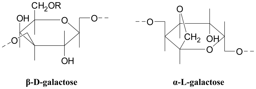 Agars, the gel-forming polysaccharides extracted from certain families of rhodophyta, mainly Gracilariaceae and Gelidiaceae [56], are linear polymers with a sugar skeleton consisting of alternating 3-linked β-D-galactopyranosl and 4-linked 3,6-anhydro-α-L-galactopyranosyl units [57]. The basic structure of the constituent galactose residues is shown in Figure 7. Agar may be fractionated into two components [58]: