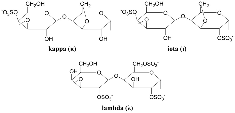 In carrageenans, β-D-galactose alternates with α-D-galactose, not α-L-galactose as in agars. The degree of sulfation in carrageenans is generally much greater than that in agars. Based on physical properties, carrageenans are commonly classified into three types; kappa (strong rigid gels), iota (soft elastic gels) and lambda (thickening polymer) [34]. The basic structures of the three classes are shown in Figure 8.