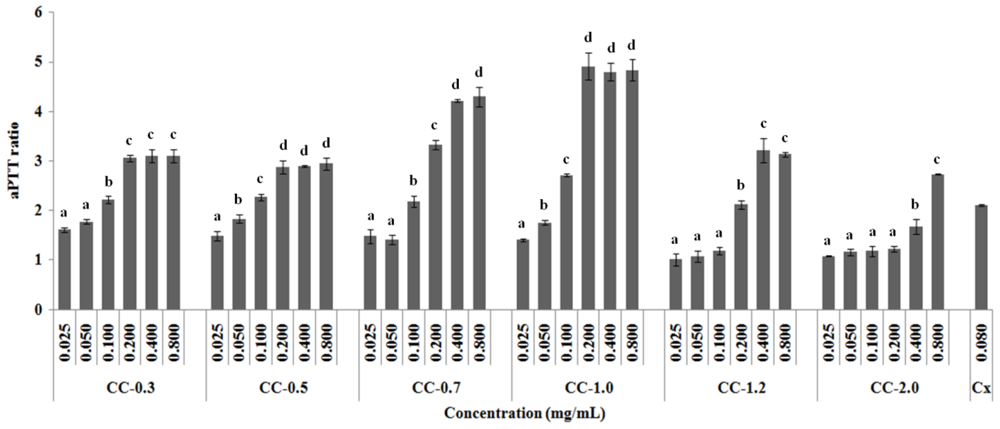 Anticoagulant activity by aPTT test. Results were expressed as aPTT ratio, obtained by dividing clotting time achieved with the anticoagulant by that obtained with the control. Data are expressed as means ± standard deviation of four determinations; a,b,c,d Different letters indicate a significant difference between each concentration of the same sulfated polysaccharide using one-way Anova followed by the Student-Newman-Keuls test (p < 0.05). Cx: Clexane®.