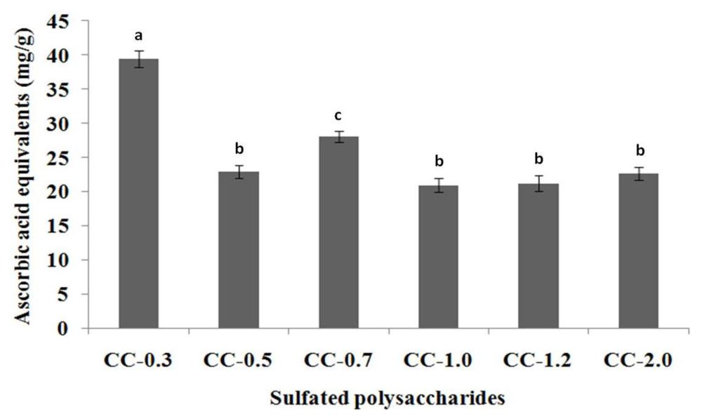 Total antioxidant capacity of sulfated polysaccharides extracted from the marine brown seaweed C. cervicornis. The results are expressed as ascorbic acid equivalents. Each value is the mean ± SD of three determinations: a,b,c Different letters indicate a significant difference (p < 0.05) between sulfated polysaccharides.