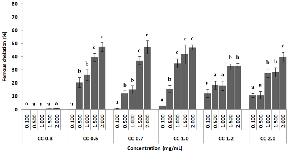 Ferrous chelating activity of sulfated polysaccharides from the brown seaweed C. cervicornis. Each value is the mean ± standard deviation of three determinations: a,b,c Different letters indicate a significant difference (p < 0.05) between each concentration of the same sulfated polysaccharide.