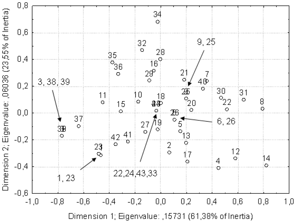 The data on hemolytic and antibacterial activity of extract analyzed with correspondence analysis. Strains are numbered as in Table 1, first column.