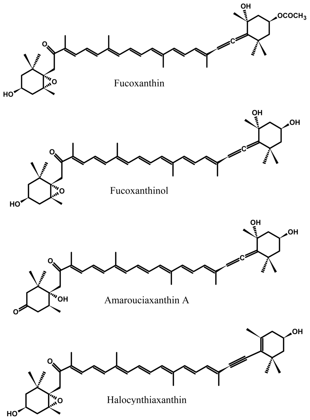 Fucoxanthin has remarkable biological properties based on its unique molecular structure similar to neoxanthin, dinoxanthin, and peridinin, which is different from that of other carotenoids such as β-carotene and astaxanthin. Fucoxanthin has an unusual allenic bond and some oxygenic functional groups such as epoxy, hydroxyl, carbonyl and carboxyl moieties in its molecule (Figure 1) that contribute to its unique structure [2,14]. The allenic bond was found mainly in carotenoids such as fucoxanthin, which was the first allenic carotenoid found in brown seaweeds [1], and was responsible for the higher antioxidant [27].