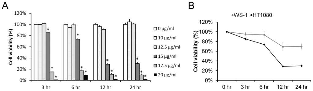 Cell viability of pardaxin-treated HT-1080 and WS1 cells. (A) HT-1080 cells were treated with 0, 10, 12.5, 15, 17.5, or 20 μg/mL pardaxin. Cell viability was measured by an MTS assay at 0, 3, 6, 12, and 24 h after treatment. Dosages which caused a significant decrease in cell growth compared to the untreated control at each time point are indicated by an asterisk (p < 0.01); (B) With 15 μg/mL pardaxin treatment, cell viability was measured by an MTS assay at 0, 3, 6, 12, and 24 h in human HT-1080 fibrosarcoma cells and human WS1 fibroblasts.