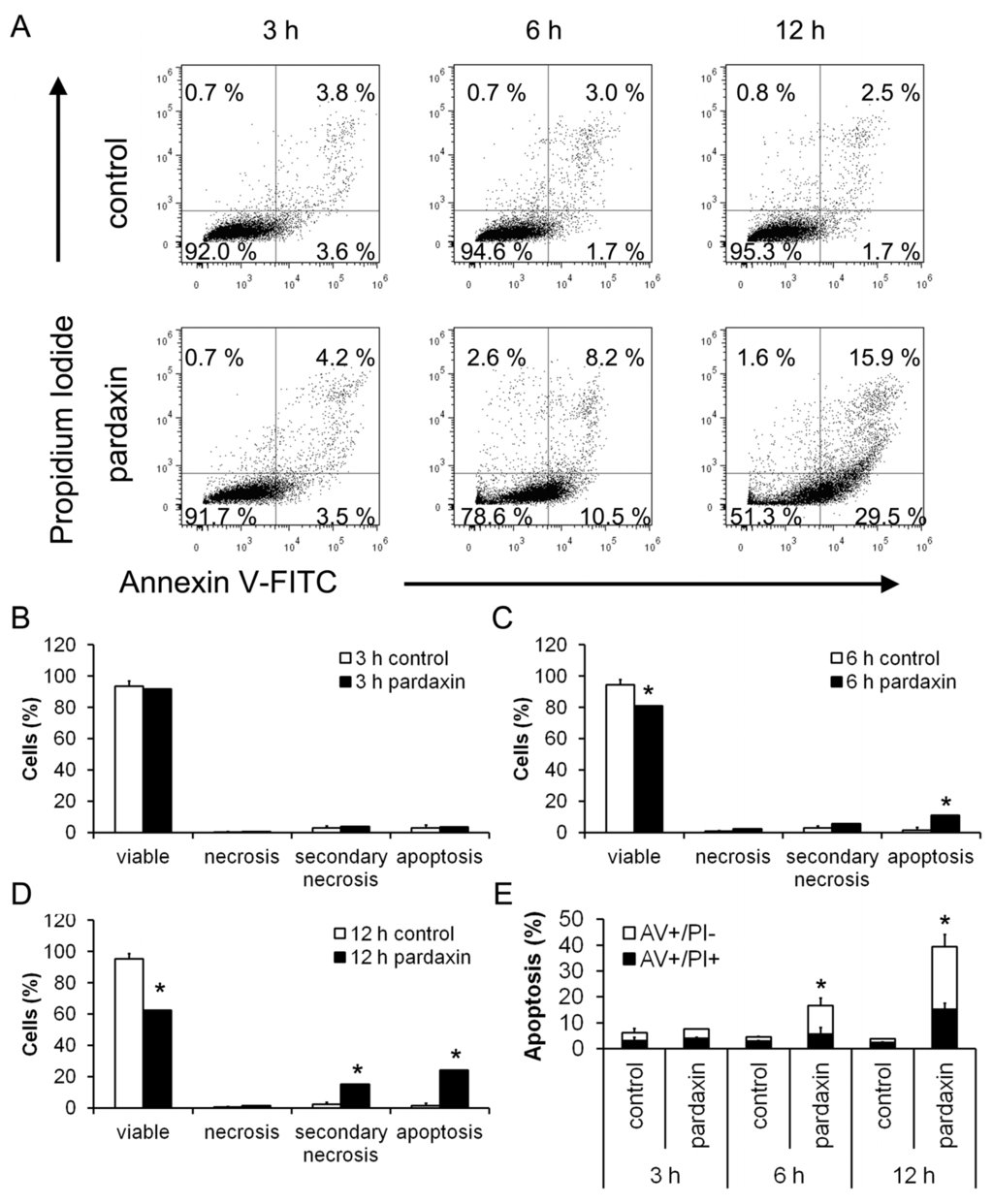 Pardaxin induced apoptotic cell death in HT-1080 cells. HT1080 cells were treated with 15 μg/mL pardaxin. Pardaxin-treated and untreated cells were harvested after 3, 6, and 12 h for annexin V (AV)/propidium iodide (PI) staining, examined by flow cytometry, and analyzed by FlowJo using bi-exponential scaling. (A) The x-axis is the annexin V signal which represents the expression of phosphatidylserine on the membrane when cells undergo apoptosis. The y-axis is the PI signal which represents the loss of membrane integrity of cells undergoing necrosis. The lower left, upper left, lower right, and upper right portions respectively indicate viable, necrotic, apoptotic, and secondary necrotic cells. Cells treated with 15 μg/mL pardaxin for (B) 3, (C) 6, and (D) 12 h, were analyzed by flow cytometry in triplicate; (E) The sum of apoptotic and secondary necrotic cells was calculated and represents all apoptotic events.