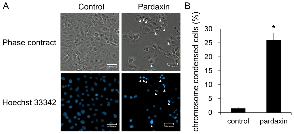 Pardaxin induced apoptosis of HT-1080 cells as examined by nuclear staining. HT-1080 cells were treated with 15 μg/mL pardaxin for 12 h. (A) Morphological assessment of apoptosis detected by Hoechst 33342 staining in triplicate. Hoechst staining and phase-contrast images of the same field were observed under fluorescence microscopy. Cells with arrows are apoptotic. Scale bars indicate 50 μm; (B) The number of apoptotic cells was calculated and normalized to the number of total cells (n = 9, p < 0.001).