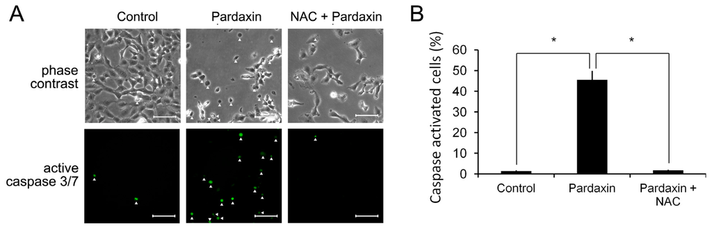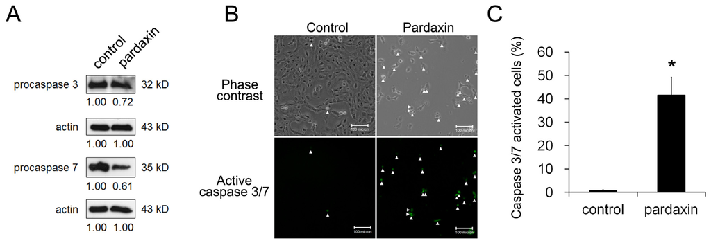 We next examined whether caspase activity increased with pardaxin. After 12 h of treatment with 15 μg/mL pardaxin, caspase-3/7 activities were examined by Western blotting or directly assessed by the CellEvent caspase-3/7 green detection reagent which is a nucleic acid-binding dye that harbors the caspase-3/7 cleavage sequence, DEVD, and is fluorescent after being cleaved and bound to DNA. The amount of procaspases-3 and -7 decreased after pardaxin treatment (Figure 4A). On microscopic observations, activated caspase-3/7 signals significantly increased after pardaxin treatment in three independent experiments (Figure 4B,C).