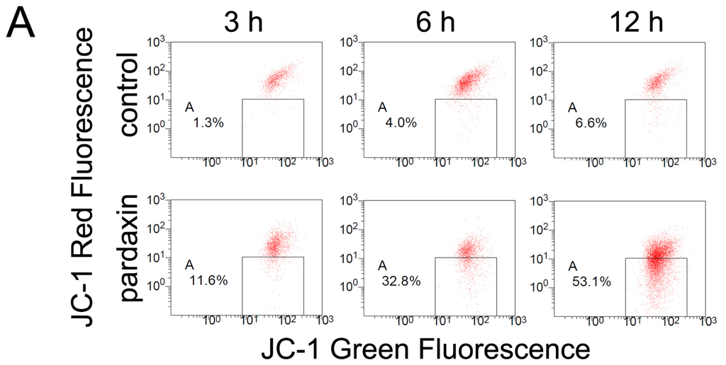 After treatment with or without pardaxin, cells were harvested and washed twice in cold PBS, and incubated with 2 μm JC-1 for 30 min at 37 °C in the dark. Cells were washed with PBS and resuspended in 500 μL PBS. Stained cells were analyzed on a Cytomics FC 500 flow cytometer to detect green fluorescence at excitation/emission wavelengths of 485/530 nm and red fluorescence at excitation/emission wavelengths of 550/595 nm, respectively.