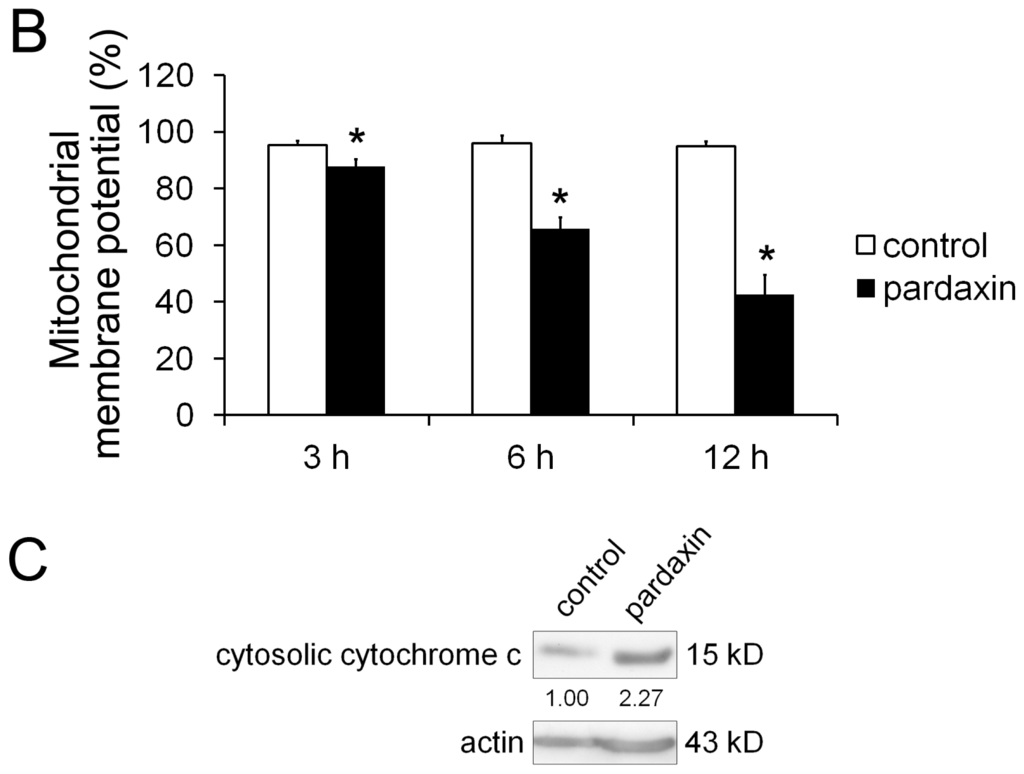 Because the loss of MMP acts as a key regulator in the intrinsic apoptosis pathway, we next examined if the MMP was affected by pardaxin. After treatment with 15 μg/mL pardaxin for 3, 6, and 12 h, the population of red+/green+ cells decreased and shifted to a red−/green+ population (Figure 5A). MMPs of pardaxin-treated cells respectively decreased to 87.77%, 65.77%, and 42.70% compared to the untreated control at 3, 6, and 12 h of treatment (Figure 5B. Pardaxin also induced the release of Cyt c into the cytosol (Figure 5C) and triggered the intrinsic apoptosis pathway. This suggests that pardaxin might initiate apoptosis through depolarization of the MMP.