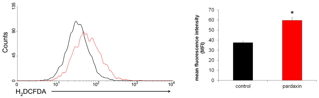 ROS production is implicated in mitochondrion-mediated apoptosis [27]. Therefore, the level of hydrogen peroxide in cells treated with 15 μg/mL pardaxin for 12 h was examined by H2DCFDA and flow cytometry. The data showed that pardaxin significantly increased the production of ROS in HT-1080 cells compared to untreated cells (Figure 6). Since losses of the MMP and ROS production are critical steps in the occurrence of apoptosis [28], it can be inferred that pardaxin-induced apoptosis might have been due to activation of an intrinsic ROS-dependent mitochondrial pathway.