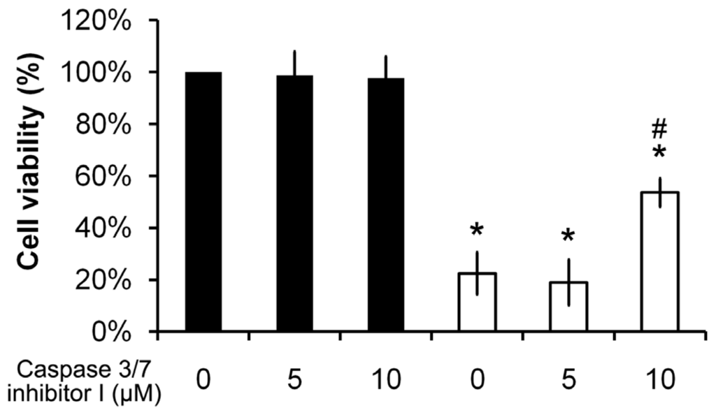 To clarify whether pardaxin-induced cell death is dependent on caspases-3/7, a caspase-3/7 inhibitor was used. Cell viability was not affected in the presence of 5 or 10 μM of the caspase-3/7 inhibitor I compared to control cells (Figure 8, columns 1–3). Significantly, cell viability of 15 μg/mL pardaxin-treated cells with 10 μM of the caspase-3/7 inhibitor I pretreatment (Figure 8, column 6) recovered to >2-fold that with pardaxin treatment only (Figure 8, column 4). Results suggest that pardaxin-induced cell death is dependent on the activation of caspases-3/7.