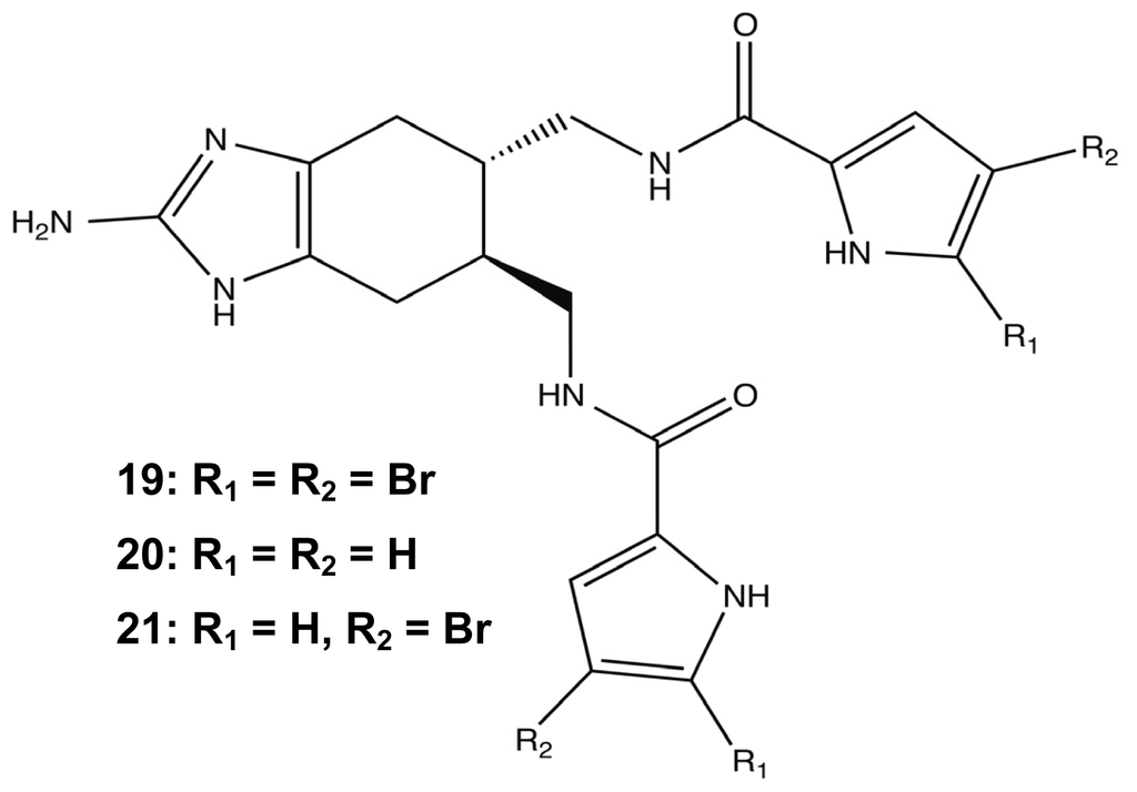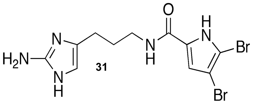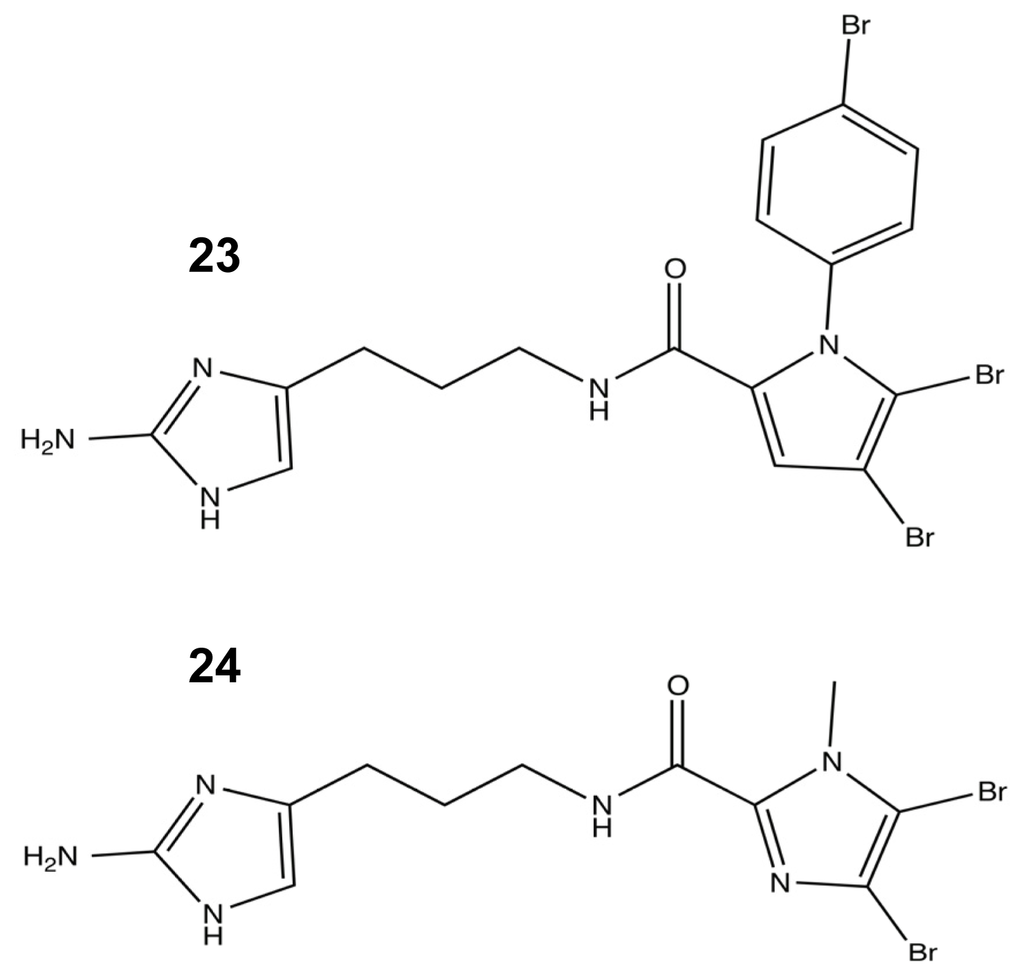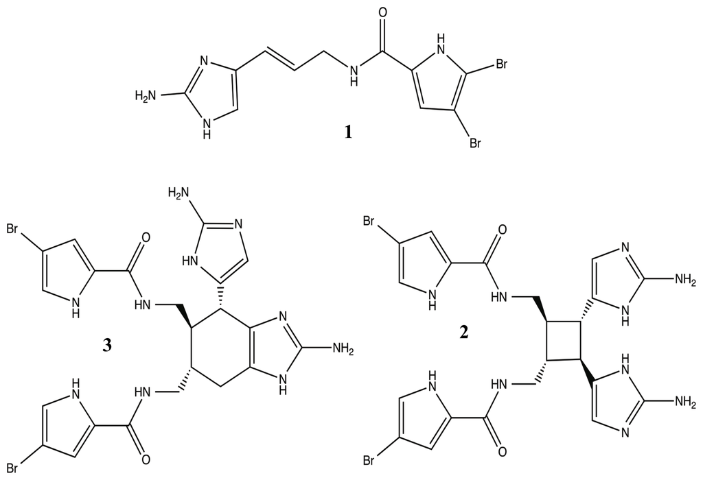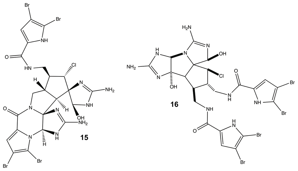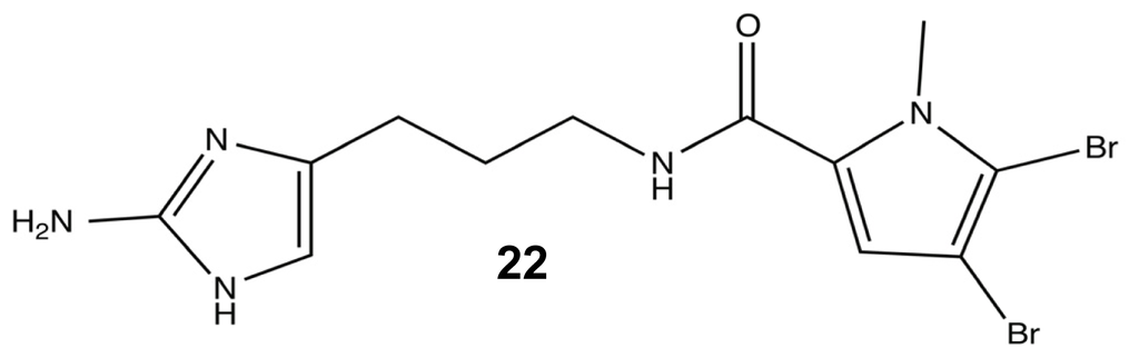 - Keifer, PA; Schwartz, RE; Koker, MES; Hughes, RG; Rittschof, D; Rinehart, KL. Bioactive bromopyrrole metabolites from the Caribbean sponge Agelas conifera. J. Org. Chem 1991, 56, 2965–2975. [Google Scholar]