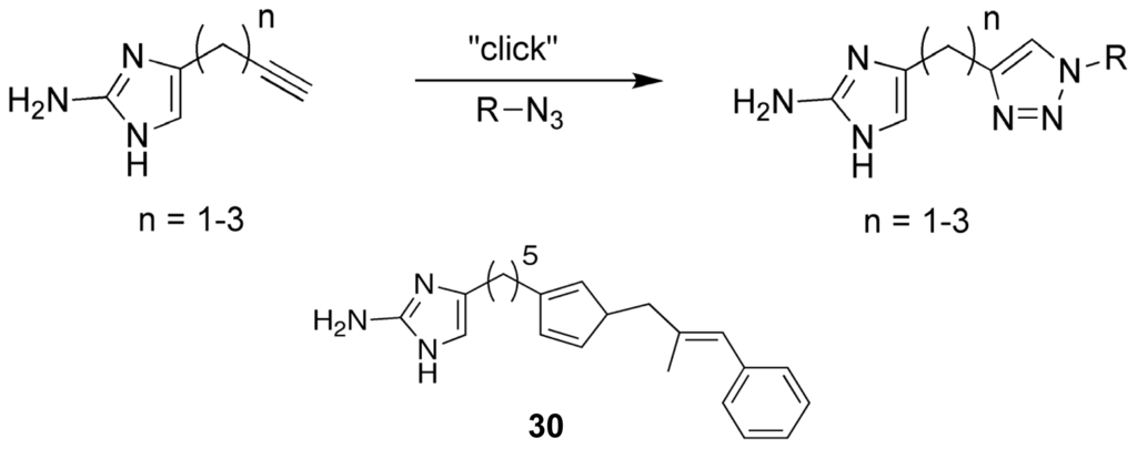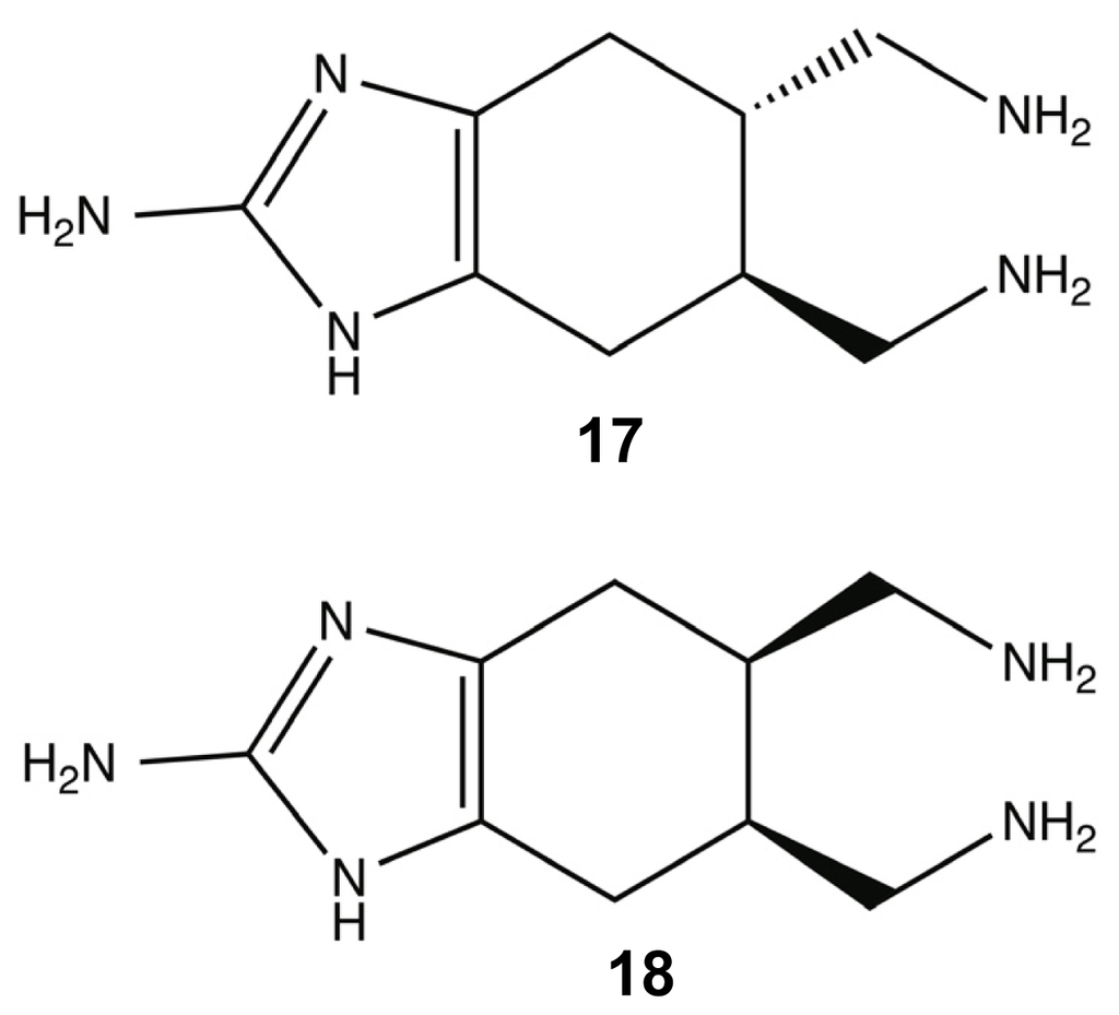 - Al Mourabit, A; Potier, P. Sponge’s molecular diversity through the ambivalent reactivity of 2-aminoimidazole: A universal chemical pathway to the oroidin-based pyrrole-imidazole alkaloids and their palau’amine congeners. Eur. J. Org. Chem 2001, 2001, 237–243. [Google Scholar]