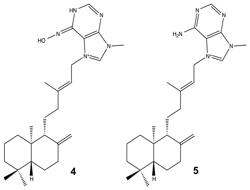 - Fu, X; Schmitz, FJ; Tanner, RS; Kelly-Borges, M. Agelasines H and I, 9-Methyladeninecontaining diterpenoids from an Agelas sponge. J. Nat. Prod 1998, 61, 548–550. [Google Scholar]