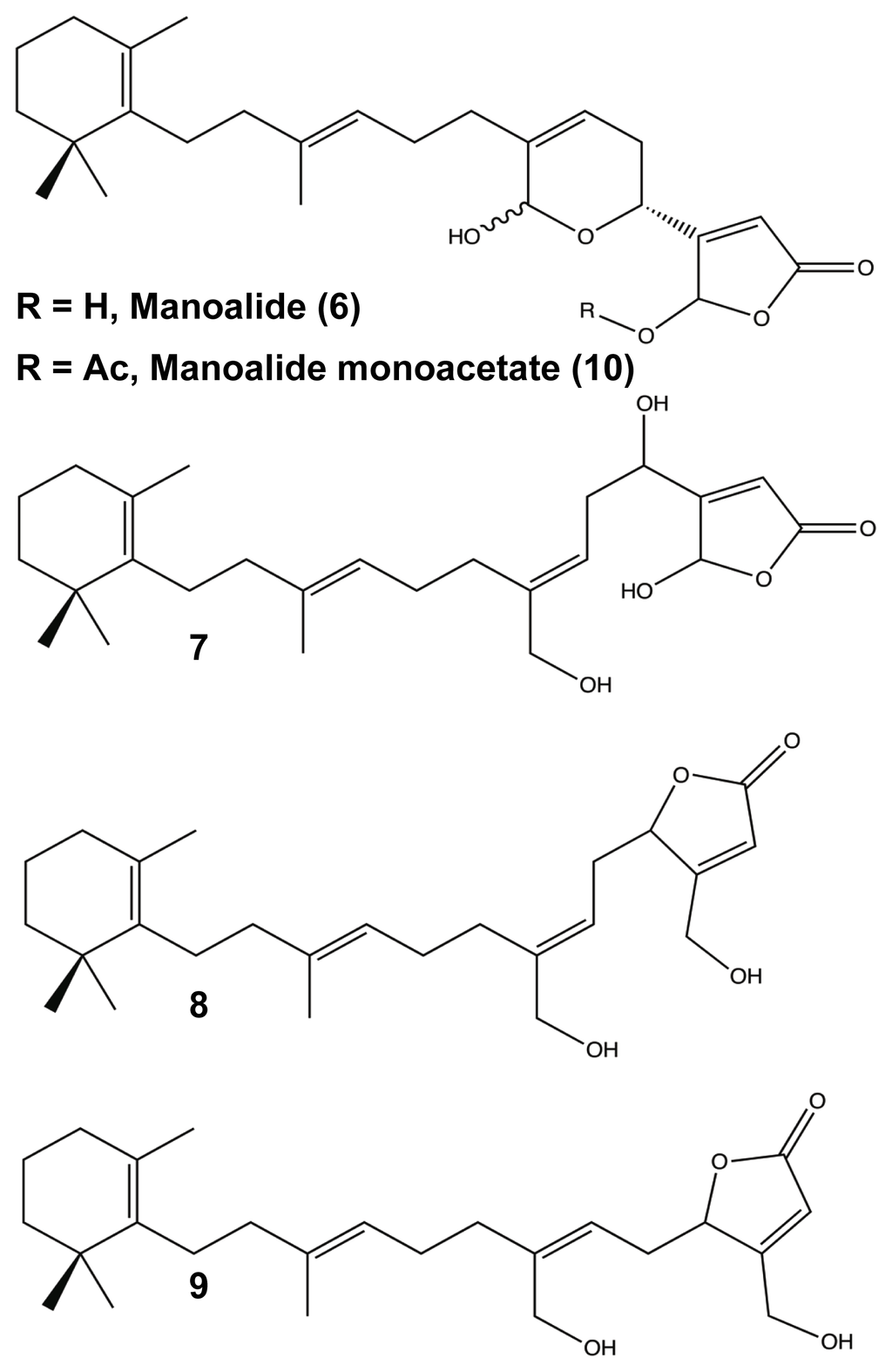 - de Silva, ED; Scheuer, PJ. Three new sesterterpenoid antibiotics from the marine sponge (polejaff). Tetrahedron Lett 1981, 22, 3147–3150. [Google Scholar]