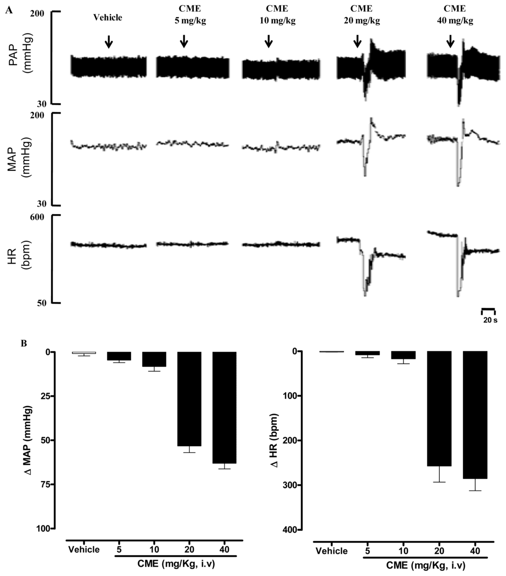 (A) Representative original tracings showing the changes in pulse arterial pressure (PAP, mmHg), mean arterial pressure (MAP, mmHg), and heart rate (HR, b.p.m.); (B) Changes in mean arterial pressure (MAP) and heart rate (HR) induced by the acute administration of increasing doses of CME (mg/kg, i.v) and vehicle. Values are expressed by mean ± SEM. (n = 5).