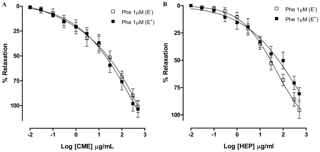 Concentration–response curves showing the relaxant effect of (A) CME (0.01–500 μg/mL); and (B) Hexane/EtOAc Phase (HEP) (0.01–500 μg/mL) on Phe (1 μM)-pre-contracted mesenteric artery rings with (■, n = 7) and without (□, n = 7) vascular endothelium, respectively. Values are expressed by mean ± SEM.