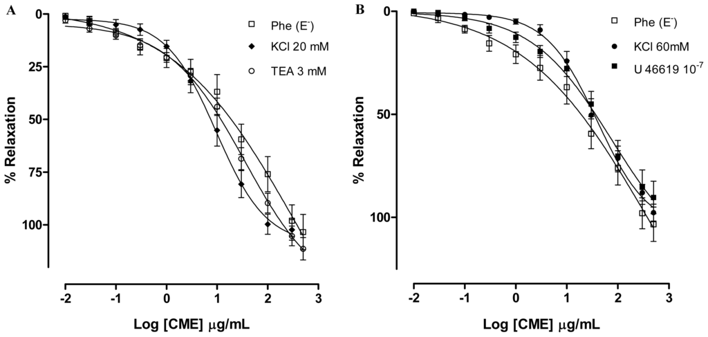 Potassium channels (K+ channels) appear to play a crucial role in controlling the cellular membrane potential and in the vascular tone. Potassium channel openers exert their biological effects by increasing the probability of opening K+ channels and a number of substances that act on K+ channels have been shown to dilate arteries by causing hyperpolarization in vascular smooth muscle cells [30]. In addition several natural products have been shown to induce vasorelaxant effects through the activation of K+ channels [31–33]. Aiming to investigate involvement of potassium channels (K+) in the vasorelaxant activity elicited by CME, the preparations were pre-incubated with Tyrode’s modified solution containing KCl (20 mM) or with tetraethylammonium (TEA, 3 mM), a non-selective K+ channel blocker. In both preparations, the vasorelaxant activity was not changed (Maximum Response = 102.3 ± 4.8%; EC50 = 25.40 ± 6.05 μg/mL; and Maximum Response = 111.2 ± 5.3%; CE50 = 16.70 ± 3.61 μg/mL; n = 7, respectively) as shown in Figure 3A. These responses were no different from the control curve, suggesting that K+ channels are not involved in the vasorelaxant effect elicited by CME.