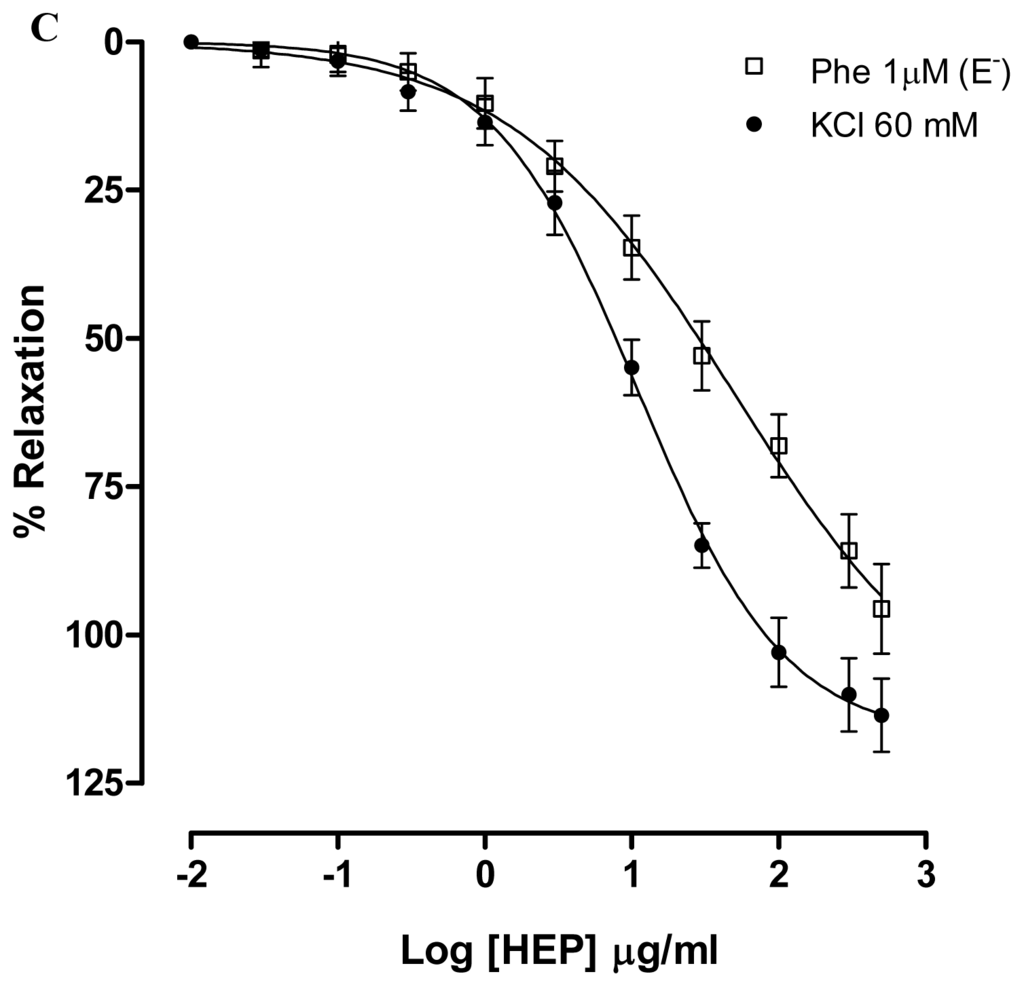 Concentration–response curves showing the relaxant effect elicited by CME (0.01–500 μg/mL, n = 6) in the presence of (A) KCl (20 mM) (♦) or TEA 3 mM (○); (B) KCl (60 mM) (●) or U-46619; (□) represents phenyephrine pre-contracted mesenteric rings without endothelium; (C) Vasorelaxant effect elicited by HEP (0.01–500 μg/mL) on KCl 60 mM-pre-contracted mesenteric artery rings (●) and Phe (1 μM)-pre-contracted mesenteric rings without endothelium (n = 7). Values are expressed by mean ± SEM.