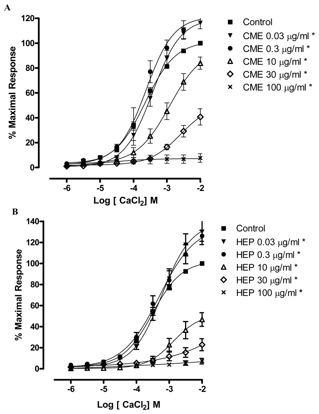 Effects of (A) CME and (B) HEP on CaCl2-induced contraction in endothelium-denuded mesenteric artery rings. Concentration-response curves for CaCl2 were determined in Ca2+-free solution containing KCl (60 mM). The curves were determined in the absence (control, ■) and after incubation with CME in (A) or HEP in (B) (▾) 0.03; (●) 0.3; (▵) 10; (⋄) 30; (×) 100 μg/mL, n = 7. * Significantly different from control (p < 0.05).