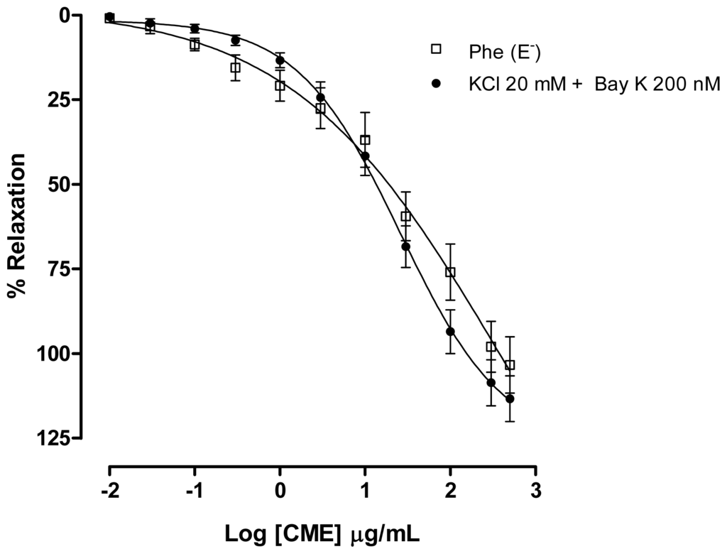In order to examine which subtype of Cav was involved in the vasorelaxant effect elicited by CME, a contraction with Bay K 8644 (200 nM), a L-type Ca2+ channel agonist, was evoked. CME induced concentration-dependent vasodilatation (Maximum Response = 113.3 ± 6.7%; EC50 = 19.45 ± 6.66 μg/mL, n = 7) and it was similar to the response found under Phe-induced contractions (Figure 5). These data indicate that L-type Cav channels could be involved in the vasorelaxant effect induced by CME.