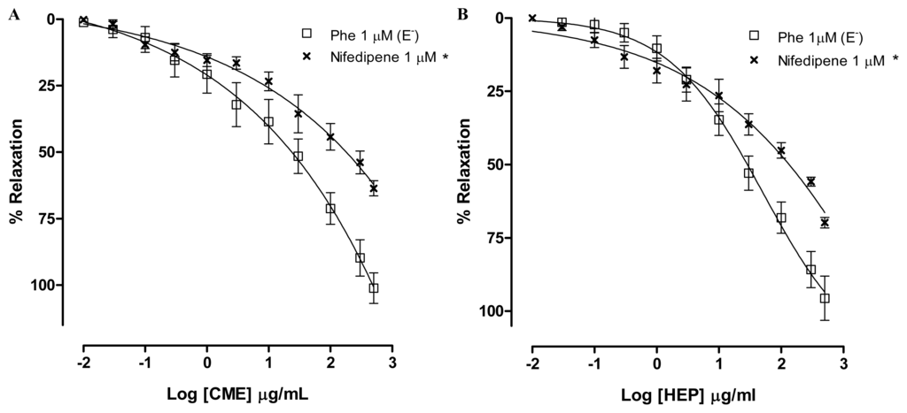Concentration–response curves showing the relaxant effect elicited by (A) CME (0.01–500 μg/mL); and (B) HEP (0.01–500 μg/mL) in the presence of nifedipine (×, n = 6); (□) represents phenyephrine pre-contracted mesenteric rings without endothelium. Values are expressed by mean ± SEM. * Significantly different from control (p < 0.05).