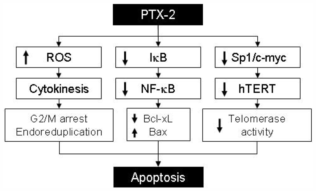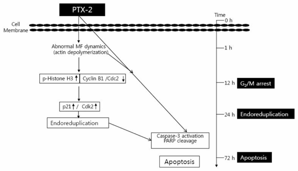 Actin is one of the most abundant and common cytoskeletal proteins for cell growth, motility, signaling, and maintenance of cell shape. Because PTX-2 affects actin polymerization, many studies have been done on the effect of PTX-2 on cell cycle arrest, endoreduplication, and apoptosis, as well as on its anti-inflammatory effects. The rest of the review will discuss the effect of PTX-2 on the above phases by relating PTX-2 to different cellular signaling cascades.