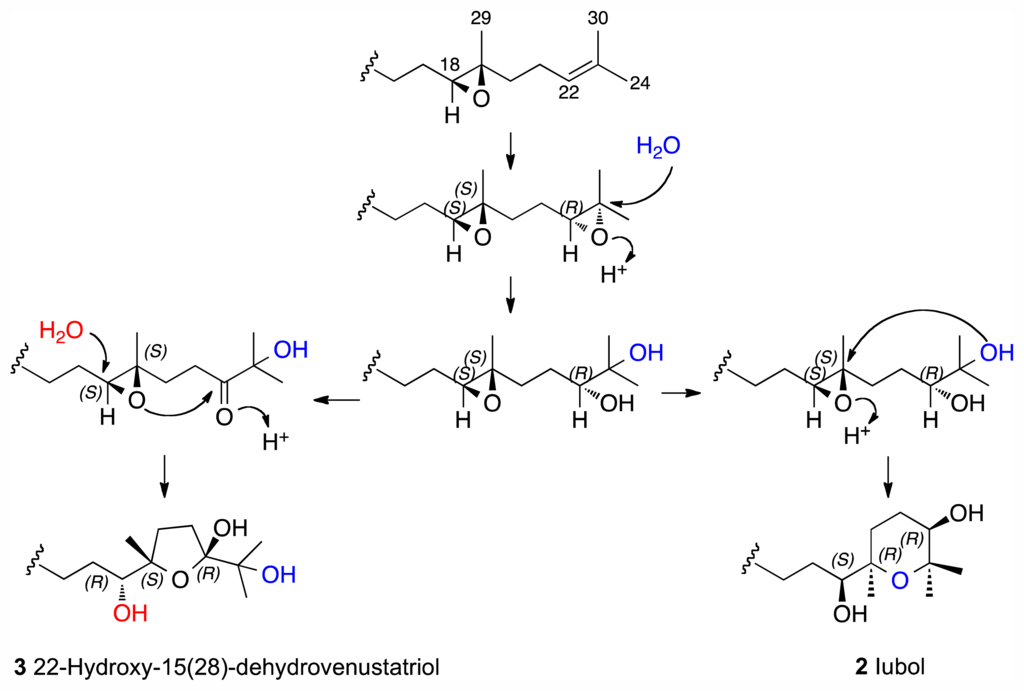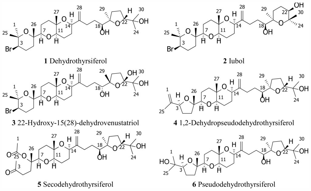 Further investigation of the minor constituents present in the fresh alga L. viridis led to the isolation of four novel polyethers, iubol (2), 22-hydroxy-15(28)-dehydrovenustatriol (3), 1,2-dehydropseudodehydrothyrsiferol (4) and secodehydrothyrsiferol (5). Herein, we describe the isolation and structure determination of these compounds as well as their cytotoxic effects in several cancer cell lines (Figure 1).