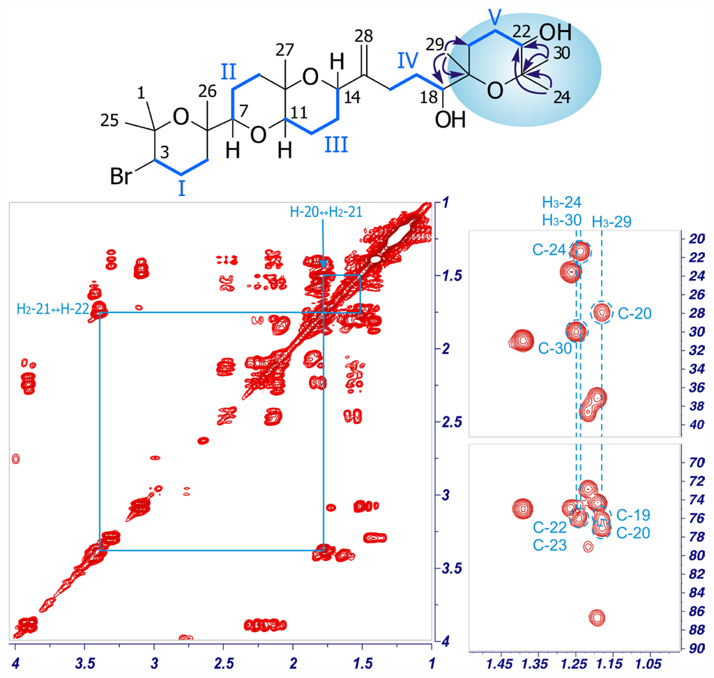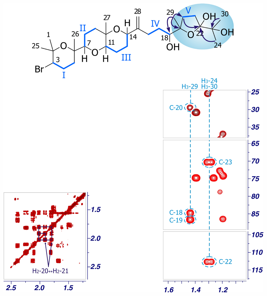 22-Hydroxy-15(28)-dehydrovenustatriol (3), was obtained as an amorphous white solid, [α]25 D +15.2 (c 0.07, CHCl3). The molecular formula of 3, C30H51O7Br, deduced by ESI-HRMS (m/z 625.2695/627.2723, [M + Na]+), indicated the presence of an additional oxygen atom with respect to dehydrothyrsiferol (1) [7,12]. Comparison of the 1H and 13C NMR data of 3 with those reported for 1 clearly revealed that 3 shares the same carbon skeleton with 1, but contains an additional oxygen atom at the C-19→C-24 moiety (Table 2). Thus, a detailed analysis of the 1H–1H COSY and HSQC spectra confirmed the existence of the same four 1H–1H spin systems (Fragments I–IV) observed in the C-1→C-18 portion of 1 (Figure 5). However, in contrast with 1, the terminal moiety of the molecule contains only a four-proton spin system formed by H2-20 (δH 2.00) and H2-21 (δH 1.80/1.91), missing the characteristic H-22 signal. Finally, we used the HMBC experiment to connect the new and characteristic 13C signal of C-22 (δC 112.5) with H2-20 (δH 2.00), H3-24 (δH 1.29) and H3-30 (δH 1.31). In addition those correlations observed between H3-29 (δH 1.44) and C-18 (δC 84.8), C-19 (δC 86.9) and C-20 (δC 29.3) allowed us to build up the structure of the C-18→C-24 portion of 3.