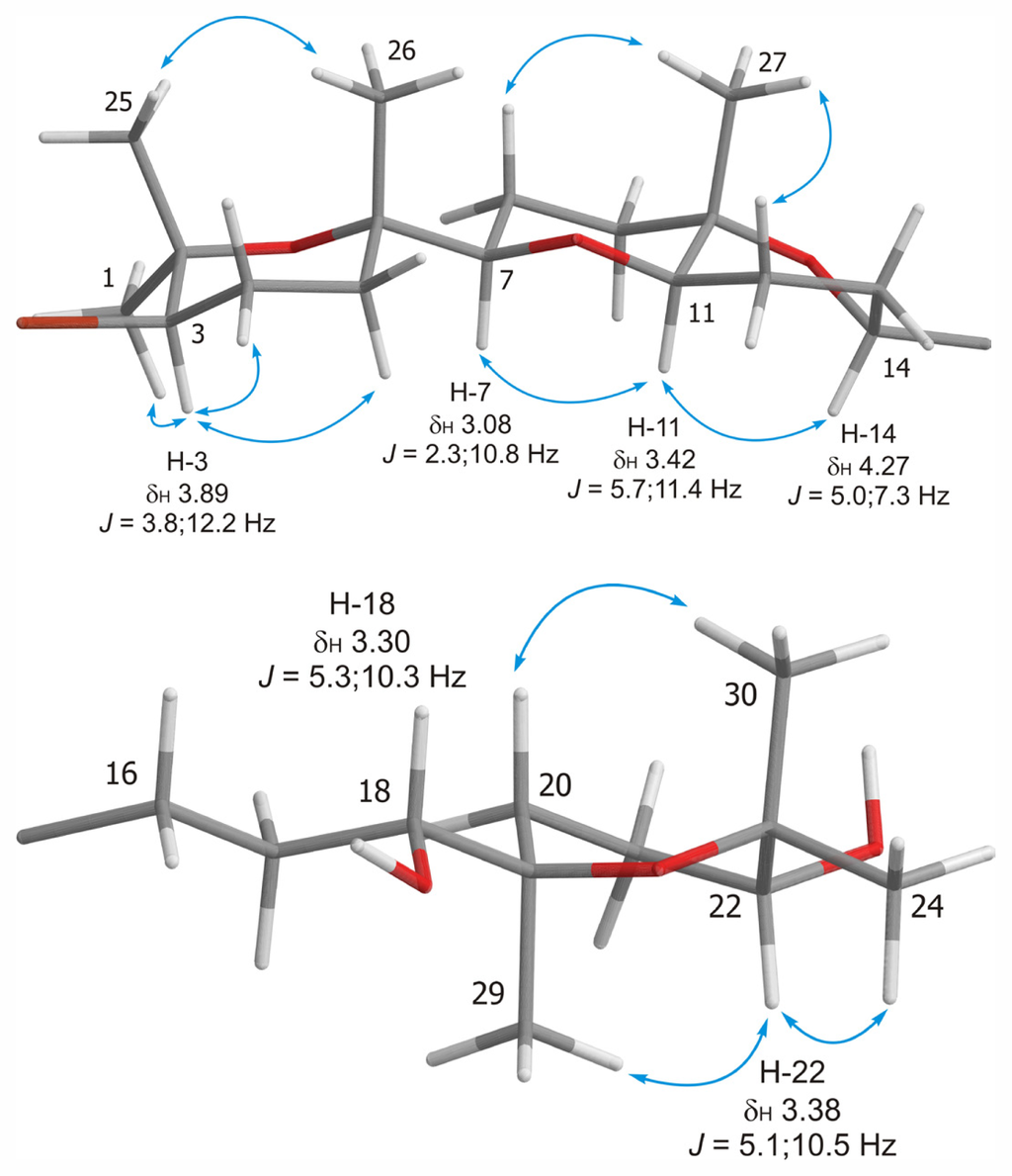 Iubol (2), was isolated as an amorphous white solid, [α]25 D +14.8 (c 0.27, CHCl3). The molecular formula, C30H51O6Br, determined by ESI-HRMS (m/z 609.3679/611.3607, [M + Na]+), turned out to be identical to that found for dehydrothyrsiferol (1) [7,12]. The structure of 2 was mainly determined from the analysis of its NMR data. Interpretation of its 1H and 13C NMR spectra together with the examination of the HSQC experiment showed that 2 consists of seven methyls, eleven methylenes, six methines and six quaternary carbons. Analysis of the 1H–1H COSY spectra enabled us to set five independent proton-proton spin systems, in a similar way to that found in other polyethers isolated from L. viridis [5,7,8]. Specifically, the fragment C-1→C-18 of 2 closely resembles that of 1, with the presence of the same four spin systems: Fragment I [H-3 (δH 3.89), H2-4 (δH 2.10/2.24), H2-5 (δH 1.53/1.80)]; Fragment II [H-7 (δH 3.08), H2-8 (δH 1.45/1.72), H2-9 (δH 1.50/1.77)]; Fragment III [H-11 (δH 3.42), H2-12 (δH 1.63/1.78), H2-13 (δH 1.82/2.03), H-14 (δH 4.27)] and Fragment IV [H2-16 (δH 2.12/2.46), H2-17 (δH 1.38), H-18 (δH 3.30)] (Figure 2; Table 1). On the other hand, notable differences were found towards the terminal moiety of the molecule (C-19→C-24), where the COSY spectrum revealed coupling between the characteristic proton H-22 (δH 3.38) and H2-21 (δH 1.75) and these sequentially to both H2-20 (δH 1.50/1.79). Finally, the structure of 2 was unambiguously assigned by the HMBC correlations. Thus, significant correlations between methyl H3-29 (δH 1.18) with C-18 (δC 77.0), C-19 (δC 76.1) and C-20 (δC 27.9), as well as those of methyls H3-24 (δH 1.24) and H3-30 (δH 1.25) with C-22 (δC 75.2) and C-23 (δC 75.7), were observed (Figure 2).