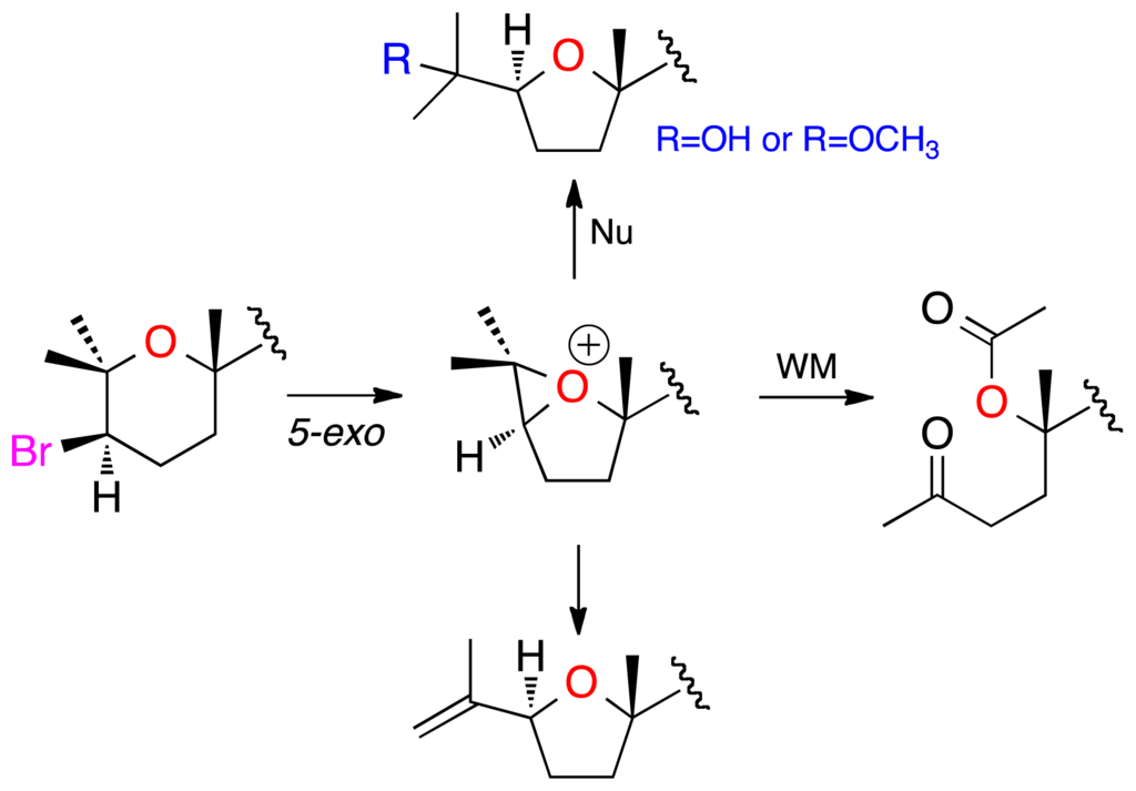 Two additional related compounds, 1,2-dehydropseudodehydrothyrsiferol (4) and secodehydrothyrsiferol (5) were isolated in this study. Analysis of their ESI-HRMS spectra allowed us to establish their molecular formulas as C30H50O6 and C30H50O8 respectively. Comparison of the 1H and 13C chemical shifts of 1,2-dehydropseudodehydrothyrsiferol (4) with other related compounds revealed great similarities with those reported for pseudodehydrothyrsiferol (6) except at the C-1→C-3 portion of the molecule (Tables 2 and 3). In fact, analysis of the 2D NMR spectra led us to the same carbon skeleton. However, the observation of HMBC correlations between the methylene protons H2-1 (δH 4.77/4.99) with C-2 (δC 145.3), C-3 (δC 83.2) and C-25 (δC 17.2) clearly indicated that the differences between 4 and 6 were due to the dehydration of the hydroxyl group attached to C-2 in 6, that yielded an exocyclic double bond at C-1→C-2 in 4 (Figure 6). With regard to secodehydrothyrsiferol (5), the NMR data showed changes with respect to 6 around the C-1→C-6 fragment. The 1H NMR spectrum revealed the existence of two new methyl groups as well as one methylene located at α-carbonyl positions. In addition, two new carbonyl groups (one ketone and one ester) were easily detected from the 13C NMR spectrum. Therefore, the structure of 5 was determined on the basis of the connectivity observed between H2-4 (δH 2.50) and H2-5 (δH 2.16/2.26) in the COSY experiment together with the HMBC correlations of H3-25 (δH 2.15) and H2-4 with C-3 (δC 208.5), those of H3-1 (δH 1.98) with C-2 (δC 170.1) and C-6 (δC 84.1) as well as those of H3-26 (δH 1.39) with C-5 (δC 29.3), C-6 (δC 84.1) and C-7 (δC 80.0). Comparison of the 1H and 13C chemical shifts, 3JH–H coupling constants, together with an analysis of the ROESY experiments of 4 and 5 showed very similar results compared to those of compound 6, and therefore the same relative configuration is proposed for the new compounds. An important feature in 4 and 5 is the absence of the bromine atom in ring A as it is common in the thyrsiferol or venustatriol series. Thus, the biogenetic origin of both compounds could be rationalized by attack of the oxane oxygen to the C-3 position that bears a bromine atom via a 5-exo process, giving an oxonium ion intermediate that would evolve as shown in Figure 7 to yield both metabolites [5]. The biogenetic origin of 5 could be rationalized by a Wagner-Meerwein rearrangement. These rearrangements have been confirmed experimentally in many cases and are almost always consistent with the participation of an oxonium ion intermediate [13,14]. In order to confirm the previous proposal, we induced this rearrangement in dehydrothyrsiferol (1). Therefore, 1 was treated with AgNO3 using either methanol:water (1:1) or anhydrous acetonitrile as solvents. In the first case, using a methanol:water (1:1) mixture, the reaction yielded pseudodehydrothyrsiferol (6) as well as the methoxy derivatives at C-2 and C-3 positions. The relative yields of this reaction could be modulated changing the methanol:water ratio. On the other hand, when an aprotic solvent was used, three compounds showing m/z of 506 were identified by LC-MS although the main product was 1,2-dehydropseudodehydrothyrsiferol (4) [15,16].