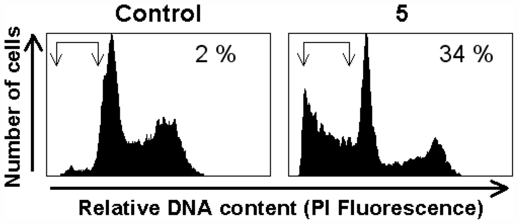 Induction of apoptosis by secodehydrothyrsiferol (5) in T-cell leukemia cells. Jurkat cells were treated with 20 μM of 5 for 48 h. Afterwards apoptosis was quantitated as the percentage of cells in the sub-G1/G0 region (arrows) in cell cycle analysis by flow cytometry. Untreated control cells were run in parallel. The percentage of apoptotic cells is indicated in each histogram.