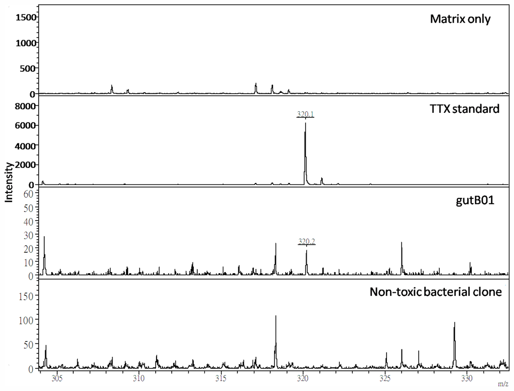 MALDI-TOF mass spectra of toxin extract isolated from gutB01. Only the TTX standard and sample of gutB01 exhibited the mass of 320.2 Da [M + H]+ (corresponding to the mass of protonated ion of TTX), but not the matrix and toxin extract from a non-toxic bacterial clone.