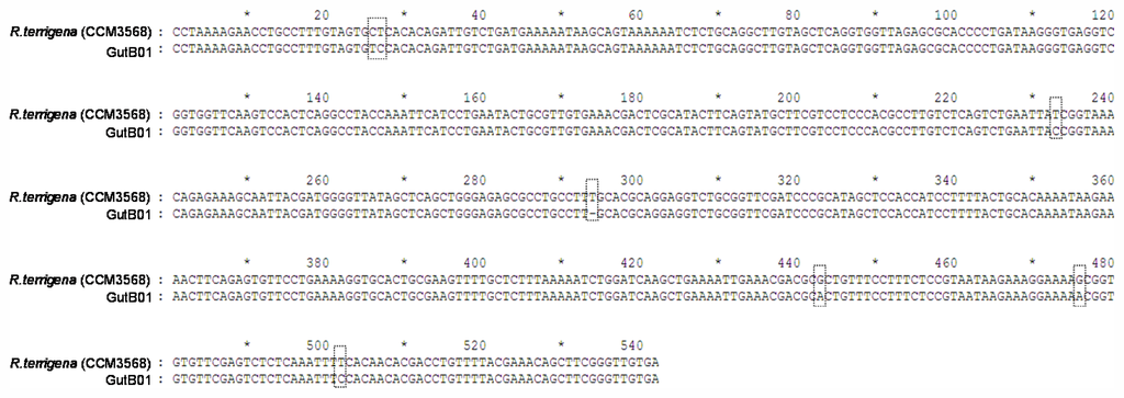 16S-23S rDNA ITS sequences of the strain gutB01. The most similar sequence obtained from bioinformatic search against the NCBInr database was the sequence from Raoultella terrigena (CCM3568, Accession no. EU623235). The alignment of both sequences and their differences are shown (nucleotides highlighted with dotted lines). There are 7 mismatches/gaps between these two sequences (with 542 nucleotides).
