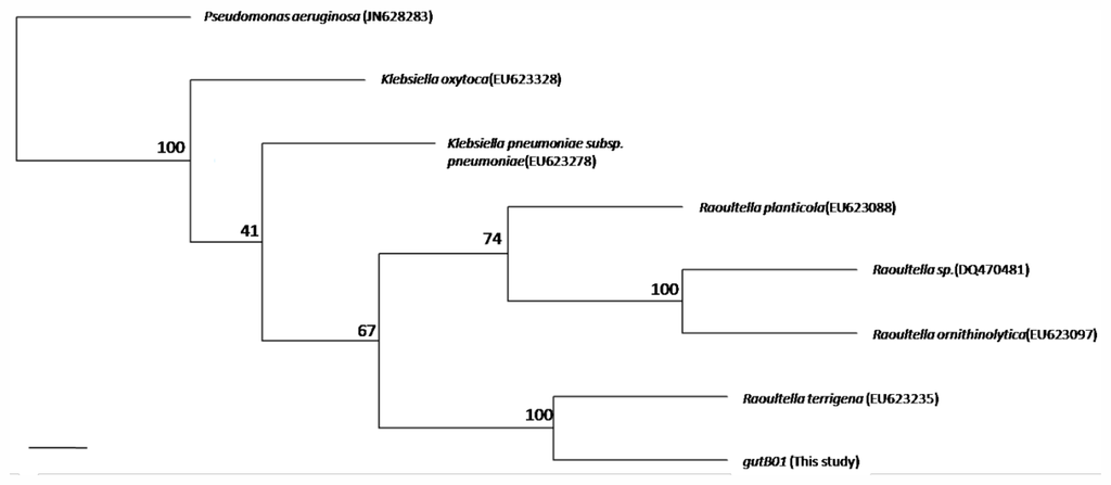 Neighbor-joining tree showing the phylogenetic relationship of the present strain gutB01 with other Raoultella (Klebsiella) species based on the ITS (16S-23S rDNA ITS) sequences. The numbers represent the percentage of 1000 replications (bootstrap support) for which the same branching patterns were obtained. Pseudomonas aeruginosa (JN628283) is employed as the outgroup reference. NCBI accession numbers of the ITS sequences used for the study are EU623235 (Raoultella terrigena), EU623088 (Raoultella planticola), EU623097 (Raoultella ornithinolytica), DQ470481 (Raoultella sp.), EU623278 (Klebsiella pneumonia subsp. pneumoniae), and EU623328 (Klebsiella oxytoca). The scale bar indicates 1% divergence.