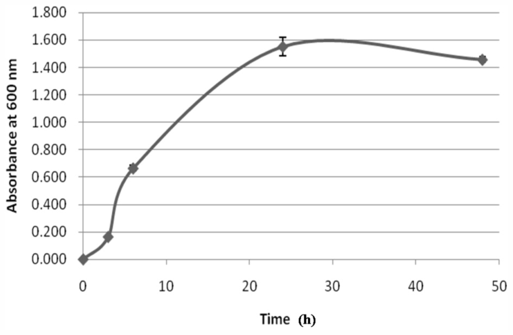 Based on the morphological and physiological analyses (Table 3), the bacterial strain gutB01 was found to be non-sporing, non acid-fast and Gram-negative rod shaped. The colonies of the strain were circular, convex, and had a diameter of between 2 and 4.5 mm. Growth was observed between 20 °C and 37 °C, 0% and 3% NaCl, pH 7 and 9. The growth curve of the strain gutB01 is shown in Figure 4. As can be seen from the curve, the strain reached the end of the log phase after 24 h incubation.
