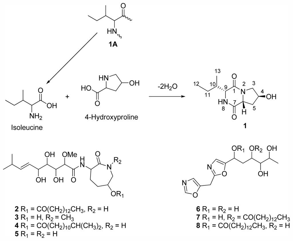 Sponges from the genus Stelletta are known to produce a number of other bioactive classes of compounds, including but not limited to steroids [10], alkaloids [11,12], isomalabaricane triterpenes [13], acetylenic acids [14] and lysophosphatidylcholines [15]. Initial interest in the methanol (MeOH) extract of the sponge Stelletta sp. was motivated by to its potent activity in the NCI 60 cell line screen and a unique COMPARE analysis profile (average GI50 0.5 μg/mL) [16]. This profile was different to that of the standard chemotherapeutic agents paclitaxel, cisplatin, gemcitadine, bryostatin 1, didemnin B, tamoxifen and vinblastine (data provided by NCI). Subsequent bioassay-guided investigations of this extract led to the isolation of a new DKP cyclo-(4-S-hydroxy-R-proline- R-isoleucine) (1), the previously reported bengamides; A (2) [17], F (3) [18], N (4) [19], Y (5) [20], and the previously reported bengazoles; Z (6) [20], C4 (7) [21] and C6 (8) [21]. Described in this publication is the isolation and structure elucidation of 1, together with the activity of compounds 1–8.