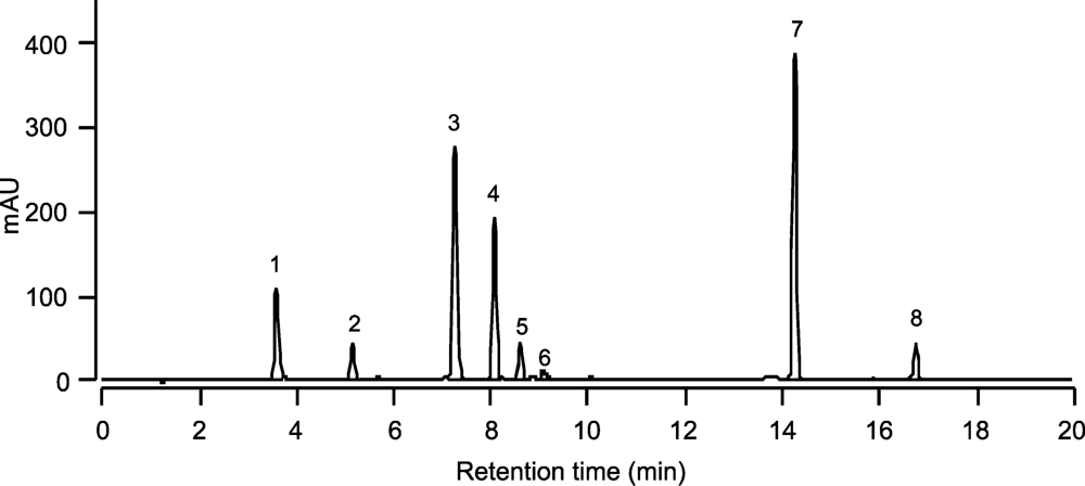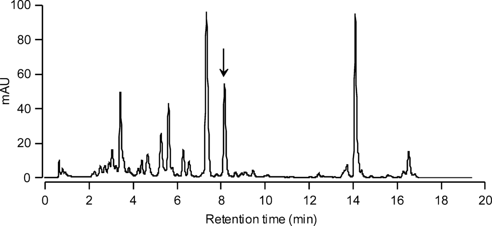 HPLC absorbance chromatogram of the extract from cultured C. cf. verruculosa.