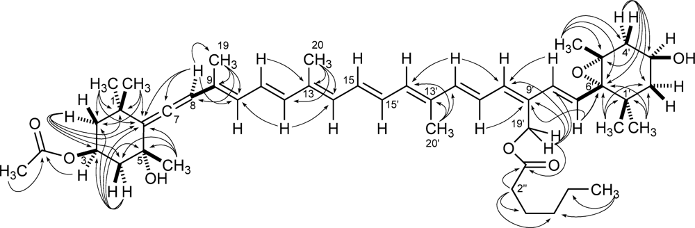 Most of the information used for structure elucidation came from one- and two-dimensional NMR spectroscopy. The general features of the proton NMR spectrum (C6D6) resembled those of carotenoids, with several olefinic protons between δ 6 and δ 7, and 10 methyl singlets between δ 1.87 and 1.08. However, one of the ten methyl signals (δ 1.74) was part of an acetyl group, as shown by its correlation peak with the carbonyl carbon atom at δ 169.2 in the HMBC spectrum. Other notable features of the proton NMR spectrum were (i) the AB system at δ 5.13 and 5.07 (H2-19’) of an oxymethylene group, (ii) two oxymethine protons at δ 5.69 (H-3) and δ 3.78 (H-3′), a methyl triplet at δ 0.78 (H3-6″) and a methylene triplet at δ 2.14 (H3-2″), indicative of an acyl chain and (iv) an olefinic proton singlet at δ 6.03 (H-8), which showed correlation peaks in the HMBC spectrum with two non-protonated carbon atoms at δ 202.1 (C-7) and 117.8 (C-6), and was therefore part of an allene system. The observed structural features were suggestive of a structure similar to vaucheriaxanthin (2), but a direct comparison of spectral data was hindered by the presence of the two additional acyl groups. A detailed analysis of the correlation peaks observed in the COSY, HSQC, and HMBC (Figure 4) spectra demonstrated that the planar structure of moraxanthin is indeed the same as that of vaucheriaxanthin, except for the presence of an acetyl group at position 3 and a hexanoyl group at position 19’.