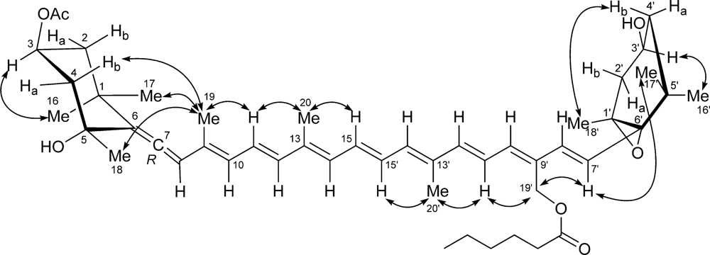 The E configuration of double bonds at positions 11, 15, 7’, and 11’ was evident from the large trans coupling constant values of the relevant protons (see Table 2). The E configuration of double bonds at positions 9, 13, and 13’ and the Z configuration of the double bond at position 9’ were determined from the ROESY spectrum, displaying correlation peaks of H3-19 with H-11, H3-20 with H-15, H3-20’ with H-15’, and H2-9’ with H-11’.