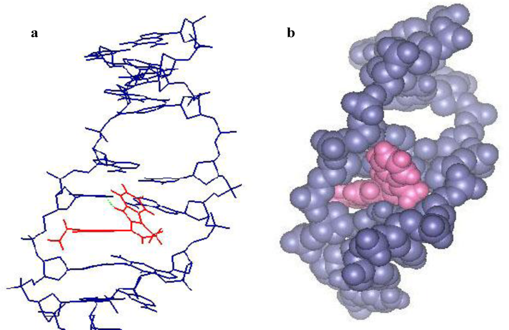 Plot of the d(CGCATGGG)2-compound 2 complex. (a) Line plot: Three-dimensional structural model of 2 with DNA receptor binding site; (b) Space-filling plot: Compound 2, red; DNA duplex, blue.