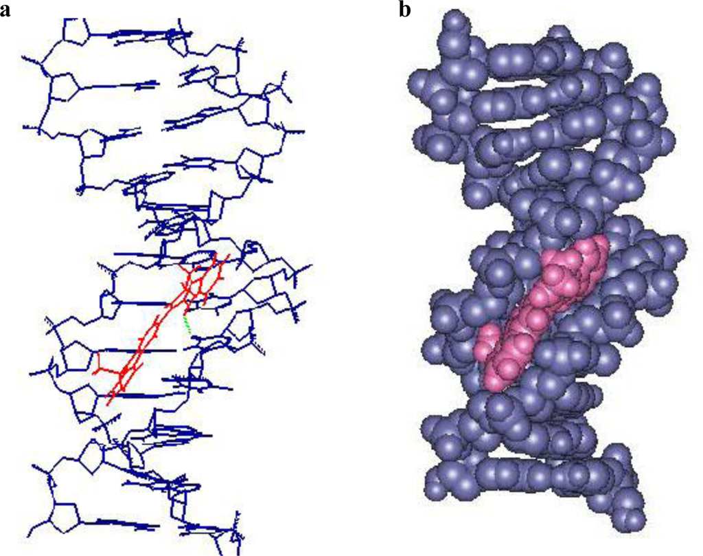 Plot of the d(CGCGAATTGCG)2-compound 2 complex. (a) Line plot: Three-dimensional structural model of 2 with DNA receptor binding site; (b) Space-filling plot: Compound 2, red; DNA duplex, blue.