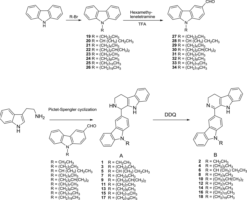 The basic strategy for the synthesis of the target substances involved molecular modeling and SAR studies of manzamine analogs. To improve our knowledge of the main structural requirements needed for high antitumor activity, we synthesized two new series of 1-substituted carbazolyl-1,2,3,4-tetrahydro-β-carboline and carbazolyl-3,4-dihydro-β-carboline derivatives based on the analog design of manzamine A. These new compounds bear an N-alkyl carbazole conjugated with a β-carboline-like nucleus. The main part of manzamine A illustrated in Figure 1 is similar in both shape and size to our target compounds. The distances between N atom on carbazole and N atoms on carboline-nucleus are almost the same as those in the main part. With the aim of studying the SAR, we focused on the lengh of the N-alkyl side chain on the carbazole ring. Compounds 19–26 were prepared by N-alkylation of carbazole with the appropriate alkyl bromide as depicted in Scheme 1. Subsequent synthesis of compounds 27–34 was achieved by Duff reaction, which required hexamethylenetetramine/trifloroacetic acid and the appropriate N-alkyl carbazole. Compounds 1, 3, 5, 7, 9, 11, 13, 15, and 17 (A series) were furnished from tryptamine and series of N-substituted 3-carbazolyl carboxyaldehydes (27–34, and N-ethyl-3-carboxyaldehyde, which was purchased from Sigma-Aldrich Co.) by application of Pictet-Spengler cyclization. Subsequent oxidation of 1,2,3,4-tetrahydro-β-carbolines (A) by DDQ yielded 3,4-dihydro-β-carboline derivatives (B series: 2, 4, 6, 8, 10, 12, 14, 16, 18). The preparation and spectral data for 1–34 are described in the Experimental Section.