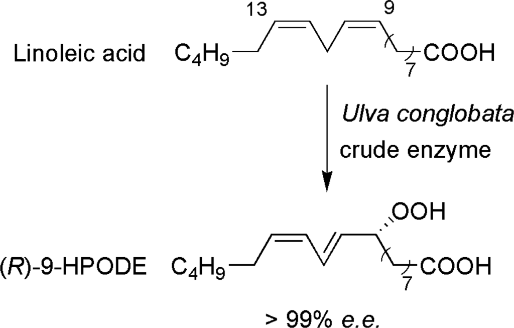 - Akakabe, Y; Matsui, K; Kajiwara, T. Enantioselective formation of (R)-9-HPODE and (R)-9-HPOTrE in marine green alga Ulva conglobata. Bioorg Med Chem Lett 2002, 10, 3171–3173. [Google Scholar]