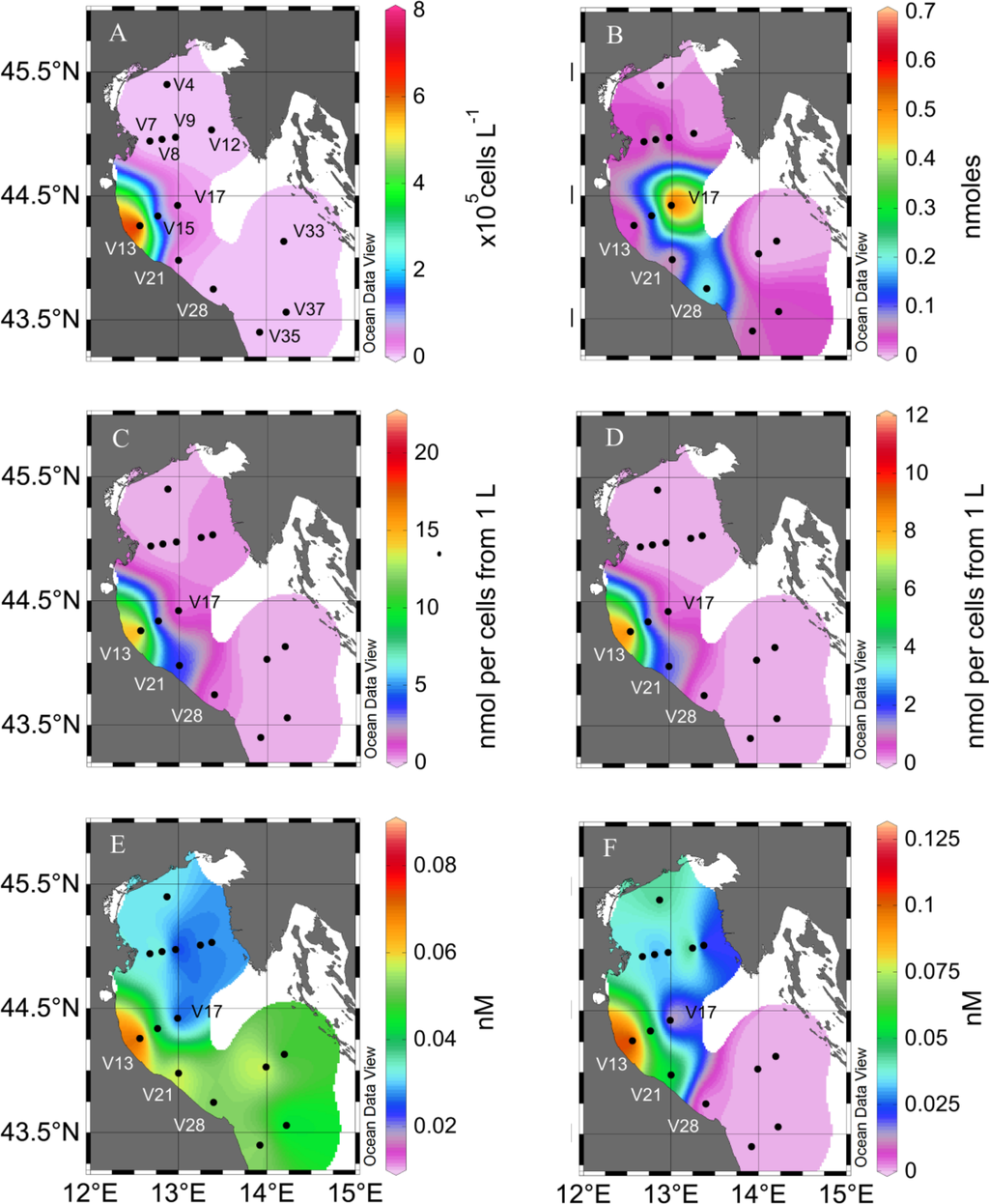 Surface distribution (0–1 m) of dissolved and particulate PUA in the Adriatic Sea in February 2008. (A), S. marinoi cell density. (B), particulate heptadienal produced by the 1.2 μm > x > 0.2 μm fraction from 1 L of seawater. (C), particulate heptadienal and (D), octadienal produced by the >1.2 μm fraction obtained from 1 L of seawater. (E), dissolved heptadienal and (F), octadienal concentrations in the seawater. The closed circles indicate the sampling stations. Note the different scaling. The colored surfaces are representation of the data presented in Table 1 and are only used to facilitate the visualization. They are not extrapolations of the concentrations.